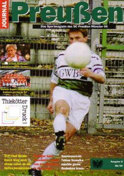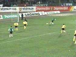 Es ist eisig kalt und so sieht der Platz auch aus. Auf der schattigen Tribünenseite ist alles gefroren und weißer Reif ziert den Rasen, auf der anderen Seite beginnt die Sonne, den Platz langsam aufzuweichen. Wirklich keine idealen Verhältnisse für gepflegten Regionalliga-Fußball. So fängt das Spiel dann auch an. Ein falscher Schritt, ein Ball in den Rücken gespielt und schon ist die "Pille" weg, im Aus, beim Gegner oder wo auch immer. Das Spiel ist langweilig und lebt eigentlich nur von der Spannung, weil man als Fan so "beteiligt" ist. Es ist bereits die vierzehnte Minute, bevor etwas Erwähnenswertes passiert. Stephan Lämmermann spielt einen schönen Doppelpaß mit Mario Krohm und dann kommt Dino Hoffmann an den Ball, gut zwanzig Meter vor dem Tor. Dino schießt sofort und Torwart Ogrinc hat Mühe mit dem Ball, denn der Preußen-TW war schon fast unterwegs in die falsche Ecke. In der zwanzigsten Minute melden sich zum ersten Mal die Preußen. Allerdings ist es unsere eigene Schuld. Andreas Bluhm bekommt den Ball nicht weg, auch Henri Heeren klärt nicht konsequent an der Strafraumgrenze. So können Gockel und Böcker einen Doppelpaß spielen, Böcker ist im Strafraum, kommt aber nicht mehr zum Schuß, sondern rutscht mit dem Ball in unseren TW André Lenz hinein. André Lenz muß kurz behandelt werden, ist aber wohl kein Problem. Dann passiert wieder lange nichts. Erst wieder in der 36. Minute, als Münster einen Freistoß bekommt, zwar in Höhe des Strafraumes, aber einige Meter zur Außenlinie versetzt. Serr flankt den Ball herein und André Lenz faustet den Ball zur Ecke. Serr läuft zur anderen Seite, um den Eckball auszuführen, zunächst abgewehrt, aber der Ball kommt wieder herein, an die Strafraumgrenze, wo Kuhn lauert. Der will den Ball völlig unbedrängt mit der Brust annehmen, doch der Ball prallt zu weit nach vorne ab, André Lenz kommt aus dem Tor und kann den Ball unter sich begraben. Mehr war nicht, Halbzeit!