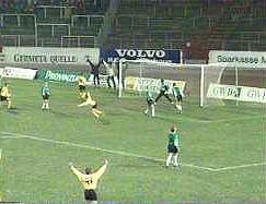 Denn rechts ist noch Gockel mitgelaufen, der auch prompt den Ball erhält und ihn ins leere Tor schieben kann. Riesige Proteste der Aachener Abwehrspieler, aber der Schiedsrichter läßt sich auf keine Diskussion ein. Aufklärung können hier wohl nur die Fernsehbilder bringen. War's das jetzt? Alemannia bäumt sich auf, kann aber keinen Druck auf den Gegner erzeugen. Die stellen sich bei ihren Kontern aber auch nicht sehr geschickt an. Schlimm wird es in der 73. Minute. Mario Krohm hält im Zweikampf einfach aus zwei Metern Entfernung den Fuß drauf und erhält eine zweite Verwarnung, das heißt gelb-rot. Klare Sache, da wird sich keiner beschweren. Aber können wir mit zehn Mann den nötigen Punkt zur Tabellenführung noch holen (wir wußten inzwischen, daß Paderborn verloren hatte). In den folgenden Minuten sieht man eigentlich nicht viel von der Unterzahl.