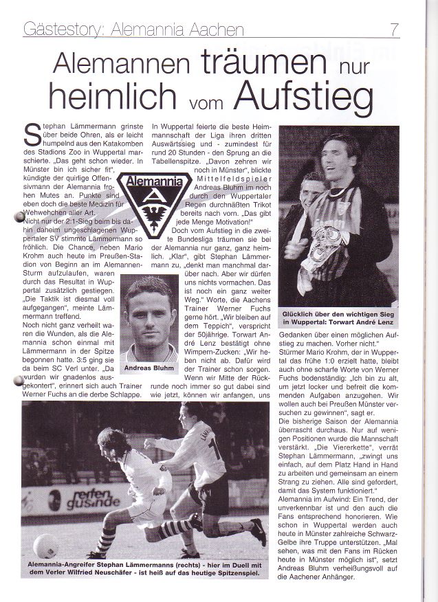 Rekordbesuch im Preußen-Stadion, wo über 5.000 Zuschauer unsere Alemannia erleben wollen. Einige kommen wohl auch um die Preußen zu sehen, die nun vier Spiele hintereinander gewonnen haben. Dem wollen wir aber nun heute ein Ende machen. Wir sind heute auch wieder zahlreich mitgekommen, zwar nicht ganz so viele wie noch in Wuppertal, aber immerhin so an die vierhundert sind wir schon. Eine Überraschung gibt es in der Aufstellung, denn Kapitän Thomas Lasser sitzt nur auf der Bank, für ihn spielt René Hahn. Thomas studiert an der Fernuni Hagen und muß dort ab und zu auch einmal persönlich auftauchen. Das war letzte Woche der Fall, so daß er die Woche über nicht beim Training sein konnte.