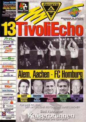 Alle Mühe hatte diese Woche Trainer Werner Fuchs, die Euphorie rund um den Tivoli so zu steuern, daß seine Spieler nicht abgelenkt werden. Tägliches Erscheinen von Presse und Medien ist eben auch am Tivoli nicht mehr gerade üblich. Morgen kommt es zum Duell zwei zur Zeit sehr erfolgreicher Mannschaften. Alemannia (4 Siege in Folge) erwartet den FC Homburg (3 Siege in Folge) und damit eine harte Nuß. Seitdem bei den Saarländer alles drunter und drüber geht, spielt die Elf sehr erfolgreich. So wurde vor Wochen schon der Trainer entlassen, als dem Präsidium einfiel, daß das wegen des laufenden Vergleichsverfahrens gar nicht ginge. Der Trainer für die nächste Saison steht schon lange fest (Ex FC K'lautern-Profi D. Hotic), ein eventuell neuer Präsident gibt auch schon fleißig Interviews usw. Aber gerade das kann auch eine Mannschaft zusammenschweißen. Immerhin ließen Saarbrücken und Paderborn Punkte in Homburg, der WSV verlor gar. Alemannia ist also gewarnt. Aber alles freut sich auf das Spiel und wenn das Wetter mitspielt, ist morgen vielleicht sogar noch einmal eine fünfstellige Zuschauerzahl zu erwarten.