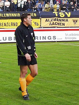 aber leider inzwischen außerhalb vom Strafraum. Diesmal versucht es Wolfram Klein mit einem direkten Schuß, aber auch sein Freistoß bringt nichts ein, und der Ball fliegt knapp über das Gehäuse der Ostwestfalen. Alemannia greift weiter an, René Hahn hat im Mittelfeld den Ball, legt mit der Hacke auf Erwin Vanderbroek, der sofort weiterleitet auf Thomas Lasser, der schon kurz vor dem Strafraum ist. Thomas Lasser verlängert den hohen Ball mit dem Kopf Richtung rechten Flügel auf Stephan Lämmermann. Der fackelt nicht lange, schieß direkt, trifft die Murmel aber nicht voll und so geht der Ball doch zwei, drei Meter links am Tor vorbei.