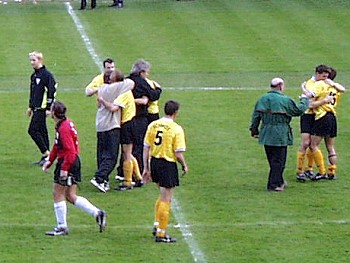 Tor, Tor, Tor, Tor, der Ball ist im Tor, 2:1 für Alemannia in der 89. Minute. Es ist unglaublich, es ist sensationell, mir fehlen die Worte. Was? Mir fehlen die Worte? Es ist unglaublich, es ist sensationell. Wir haben das Spiel innerhalb von vier Minuten gedreht und das gegen die beste Auswärtsmannschaft der Liga. Es ist einfach nicht zu glauben, ich werde umarmt von Leuten, die ich gar nicht kenne, wir schreien, wir hüpfen, wir freuen uns wie nie zuvor. Aber das Spiel ist noch nicht aus. Verl drängt noch einmal auf den Ausgleich. Unsere Spieler schlagen die Bälle ins Aus, auf die Tribüne, einfach nur weg. Dann kommt Stephan Lämmermann in der 93. Minute an den Ball, vor der Mittellinie und kein Verler weit und breit. Stephan geht auf den Torwart zu, links läuft Mario Krohm mit. Stephan ist im Strafraum, TW Ortkemper kommt raus und kluger Paß auf links, wo Mario Krohm jetzt vier Meter vor dem leeren Tor steht und .. links vorbei, unglaublich, sensationell. Den hätte unser Marcel reingemacht (Später heißt es Platzfehler, der Ball ist versprungen). Weiter geht’s, noch immer ist nicht Schluß. 95., 96., 97. Minute, dann Schlußpfiff. JAAAAAAAA es ist geschafft, wir haben 2:1 gewonnen und mein Herz klopft wie verrückt. Seit Wochen sagen wir, daß es keine Steigerung mehr gebe, aber unsere Jungs belehren uns eines Besseren. Von Woche zu Woche wird es dramatischer, aber ehrlich gesagt, lange halte ich das nicht mehr aus.