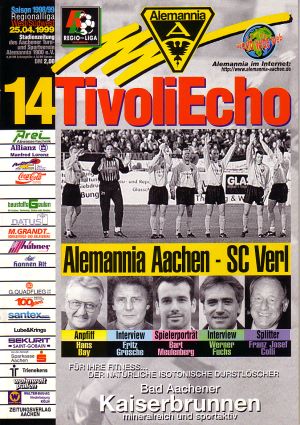 Schon eineinhalb Stunden vor Spielbeginn herrschte rund um den Tivoli ein Treiben wie auf einem Flohmarkt. Flohmarkt? Tatsächlich, auf dem Parkplatz Gut Wolf war ein Flohmarkt und die Stadt hatte „vergessen", dies der Alemannia mitzuteilen. Das durch die fehlenden Parkplätze verursachte Verkehrschaos führte dazu, daß Tausende Zuschauer nicht zu rechtzeitig am Stadion sein konnten wie geplant. Von der Autobahnausfahrt Würselen bis Krefelder Str. z.B. brauchten einige Besucher ganze zwanzig Minuten. So kam es wie es kommen mußte, das Spiel wurde mit 15 Minuten Verspätung angepfiffen. über 15.000 Zuschauer, davon ein Bus Kids aus Verl, bevölkerten schließlich die Ränge, ein tolles Bild. Tolle Geste auch von der Alemannia, da Präsident Sawalies über Stadionmikro vor dem Spiel bekannt gab, daß die Alemannia pro verkaufter Eintrittskarte DM 1,- für die Kosovo-Hilfe des DRK spenden werde. Auch in dieser Phase der Saison verliert man nicht die wichtigen Dinge des Lebens aus den Augen. Jetzt aber geht es los, it’s Showtime, Anpfiff!