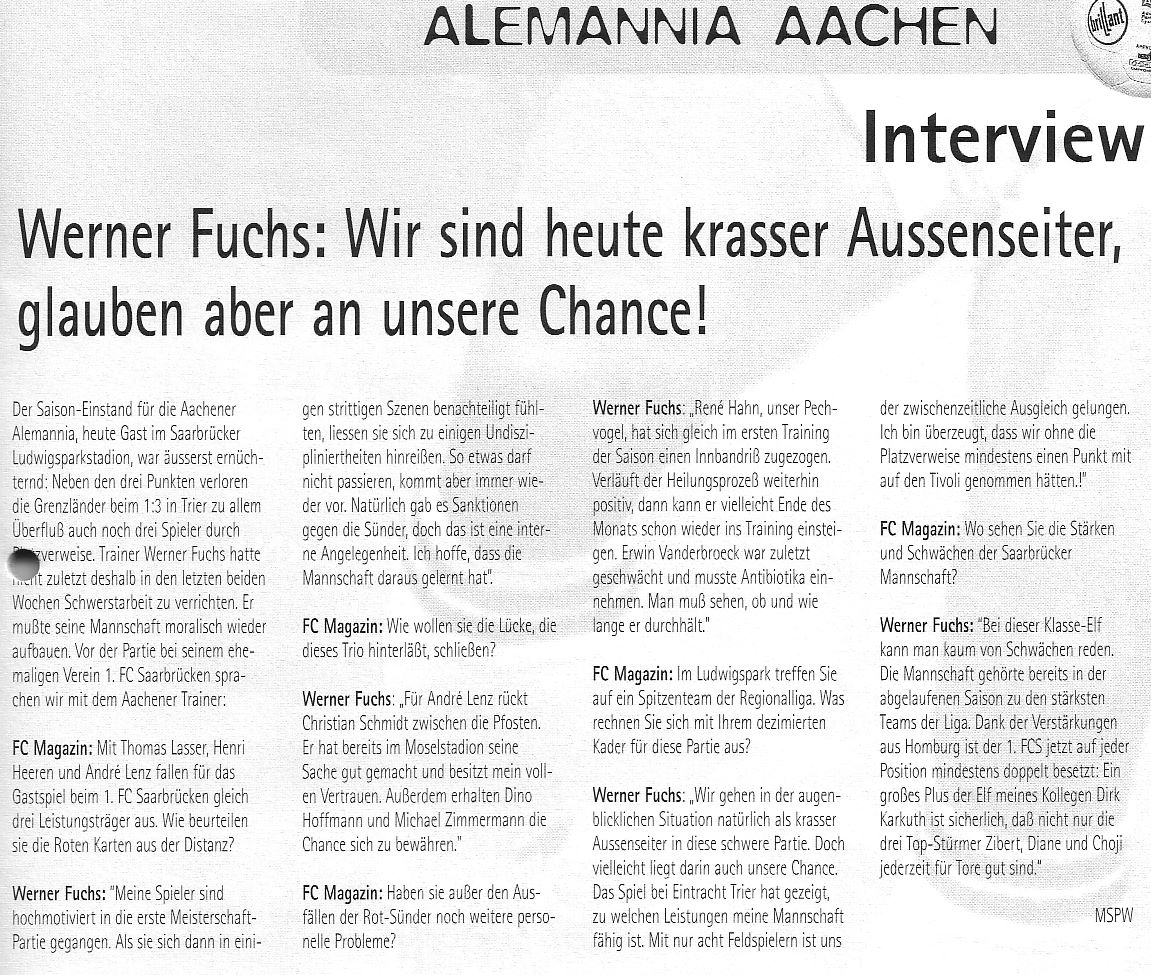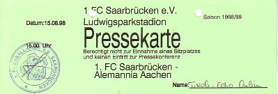 Am Samstag, aber natürlich nicht im Saarbrücker Ludwigspark, sondern im Aachener Reitstadion. Dort war man jederzeit über den Spielstand am Alemannia-Infostand informiert. Nach dem Schlußpfiff sorgte „Vize“ Dirk Courté bei der Turnierleitung dafür, daß das Ergebnis aus dem Saarland bekannt gegeben wurde, worauf ein großer Beifall für unsere Kicker fällig war. Hat's wohl auch schon lange nicht mehr gegeben.
