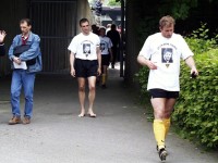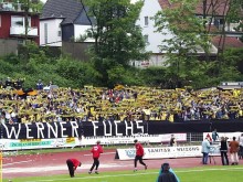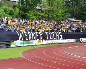 Zu Tausenden hatten sich die Fans der Alemannia aufgemacht, um im Stimbergstadion den letzten Schritt Richtung 2. Bundesliga zu schaffen. Vor dem Spiel war es still im Stadion, keine Musik, keine Anfeuerung, einfach nur Stille. In der langen Gästekurve hatten die Fans ein riesengroßes ganz in schwarz gehaltenes Transparent aufgehängt, auf dem in weißen Buchstaben der Name Werner Fuchs stand.