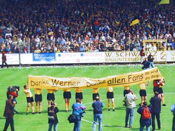 Unsere Mannschaft hatte ein Transparent dabei, an dem sich alle Spieler festhielten und auf dem nochmals der Dank an den verstorbenen Trainer Werner Fuchs ausgedrückt wurde. Auch die Fans vom Wuppertaler SV zeigten sich von ihrer besten Seite und rollten zu Spielbeginn große Fahnen aus u.a. mit den Worten " Wir trauern mit Euch". An der Mittellinie gab es dann schon vor dem Anpfiff die Meisterehrung vom Verband. Staffelleiter Heinz Leopold Schneider überreichte den Meisterpokal unter Riesenjubel an Spielführer Thomas Lasser, der die Trophäe an alle Mitspieler weitergab. Anschließend gab es noch Präsente für die Spieler, die den Verein verlassen (Lasser, Krohm, Ibrahim, Lenneper) bzw. ihre Karriere beenden (Winkhold). Eine tolle Geste des Vereins und es paßt in das Bild der ganzen Saison, daß diese Verabschiedung bei der Alemannia auch mal geklappt hat. Entsprechend groß war der Jubel auch bei den Fans, die sich ebenfalls mit riesigem Applaus verabschiedeten. Ja und das Spiel? Das konnte man wirklich vergessen, zumindest die erste Halbzeit, es passierte einfach nichts.