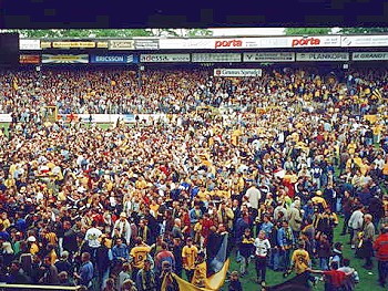 Das ist wohl die Entscheidung, zumal die Wuppertaler nicht den Eindruck machen oder so spielen, als ob sie noch an ihre Chance auf Platz zwei glauben. Trotzdem gelingt ihnen ein Tor (73.). Klemmer ist es, der im Mittelfeld einen Ball abfangen kann, einige Schritte nach vorne dribbelt und dann einen Doppelpaß mit der einzigen Sturmspitze Meinke spielt. Dann ist Klemmer durch und schiebt den Ball in die linke Ecke. Der Ex-Aachener Frank Klemmer ist damit der einzige Spieler, der es geschafft hat, zwei Tore gegen Alemannia zu schießen, und das in zwei verschiedenen Trikots (Anm.: eins noch als Remscheider in der Hinrunde). Doch auf den Ausgleich drängt der WSV nicht. Das Spiel plätschert so dahin und alles wartet nur noch auf den Schlußpfiff. Und dann passiert doch noch etwas, was kein Regisseur hätte besser inszenieren können. Unser scheidender Torjäger Mario Krohm schießt in der letzten Minute das 3:1 und verabschiedet sich so, wie er sich das wohl auch gewünscht hat, als jubelnder Torschütze. Ich glaube, wenn ich an die letzten Wochen denke, irgendwo gibt es da jemanden, der aus unserem Leben ein Drehbuch macht, mal spannend, mal komisch und manchmal leider auch tragisch. Der Rest ist schnell erzählt. Die Fluchttore zum Innenraum werden geöffnet und Schiedsrichter Englert erkennt die Zeichen der Zeit und pfeift schnell ab. Innerhalb weniger Minuten ist vom Grün des Spielfelds nichts mehr zu sehen und von unseren Spielern auch nicht. Lange brauchen sie bis zu den Kabinen und wir nutzen die Zeit, um zum Markt zu kommen. Die Meisterfeier dort haben wir uns verdient und darum wird uns auch keiner böse sein.