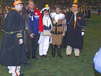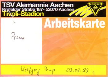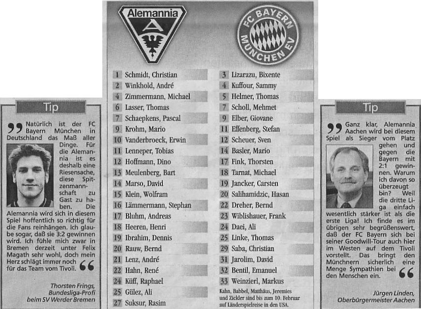 Um 17.45 Uhr wird Prinz Karneval mit Gefolge und Musikkorps in den Tivoli einmarschieren, um 18.15 Uhr die Volleyball-Damen der Alemannia (seit Sonntag Tabellenführer!) vorgestellt. Die „Halbzeit-Show“ gestalten zwar nicht Stevie Wonder und Gloria Estefan, aber immerhin die KG „Oecher Prente“ und die Stadtwache „Oecher Börjerwehr“ ;-) Nach dem Spiel gibt es gegen 20.15 Uhr Interviews des DSF mit Uli Hoeneß, Ottmar Hitzfeld und Werner Fuchs, die auch über Stadion-Lautsprecher übertragen werden. Extra für dieses Spiel wird eine Beschallungsanlage installiert, die gewährleistet, daß man auch etwas von dem hört, was gesprochen wird. Nette Geste noch der Bayern : Auf ihrer Bank Platz nehmen darf der kleine Alexander, Bayern-Fan und zur Zeit Patient des Aachener Klinikum. An den Stadionkassen gibt es eine 12-seitige Sonderausgabe der Aachener Zeitung, analog den Pokalspielen der letzten Saison. Das Spiel gegen die Bayern wurde übrigens vor 18.000 Zuschauern mit 0:5 verloren. Helmer, Scholl, Daei und zweimal Salihamidzic waren die Torschützen beim Deutschen Rekordmeister. Trainer Hitzfeld wünschte am Ende eines schönen Abends der Alemannia eine schnelle Rückkehr in den bezahlten Fußball. Fast genau fünf Jahre später sah der Tivoli die Bayern mit Ottmar Hitzfeld wieder, zum DFB Pokal-Viertelfinale ...